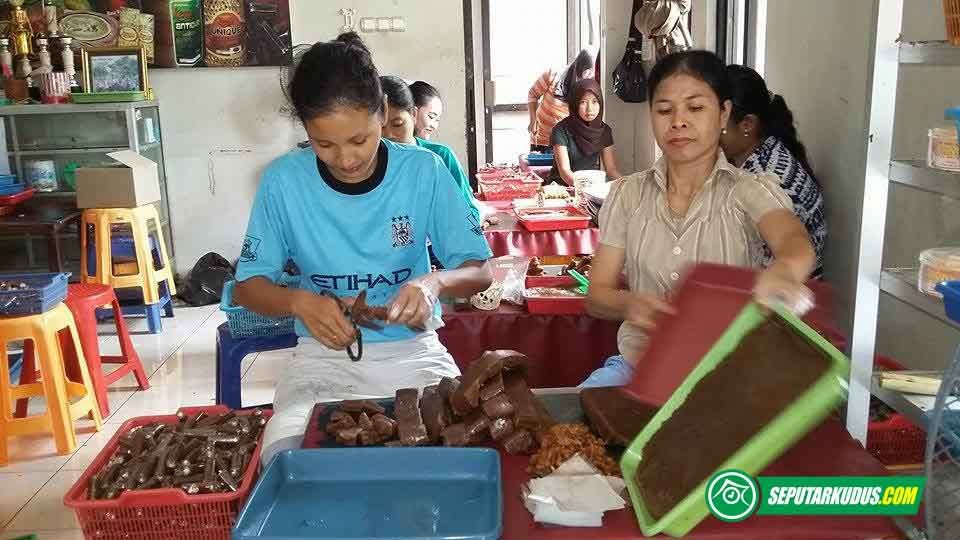 SEPUTARKUDUS.COM, SUNGGINGAN – Di dalam sebuah bangunan yang berada di Kelurahan Sunggingan, Kecamatan Kota, Kudus, tampak enam kuwali besar berisi adonan jenang. Tampak di atas perapian adonan jenang diaduk menggunakan mesin. Di ruang lain terlihat beberapa perempuan sedang mengiris jenang. Tempat tersebut yakni rumah produksi Jenang Kenia, jenang asli Kudus yang pernah ikut pameran hingga luar negeri.